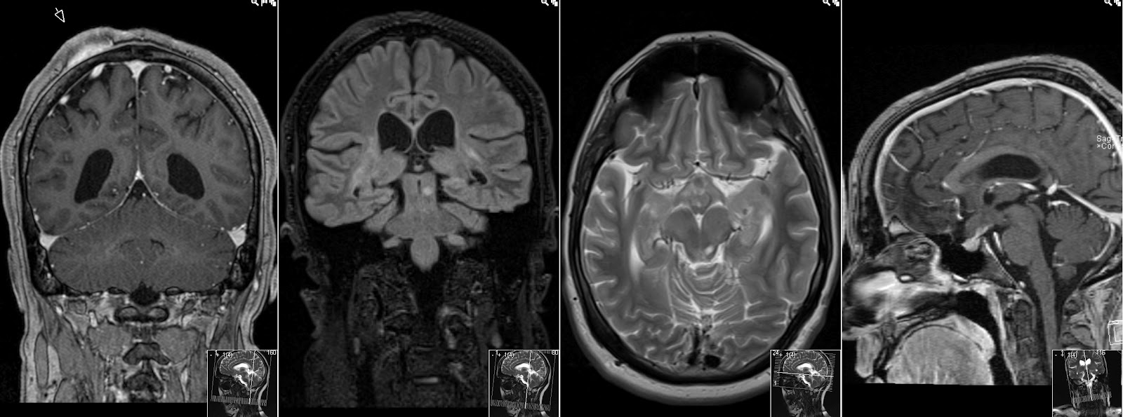This patient is known with Neurofibromatosis Type 1 (von Recklinghausen Disease). Note enlarged optic nerves on coronal T2, as well as thickened optic chiasm on coronal T1 with Gadolinium and thickened optic tracts on transversal T1 with Gadolinium. This is due to Optic Glioma. There is very little, almost no contrast enhancement. Last image, transversal T2, showing tumor infiltration in the optic tract as well as Focal Areas of Signal Intensity (FASI) - that show no enhancement.